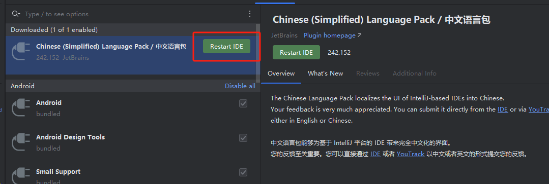 不过可以从jetbrains的插件市场下载简体中文汉化包,该包同样支持AndroidStudio