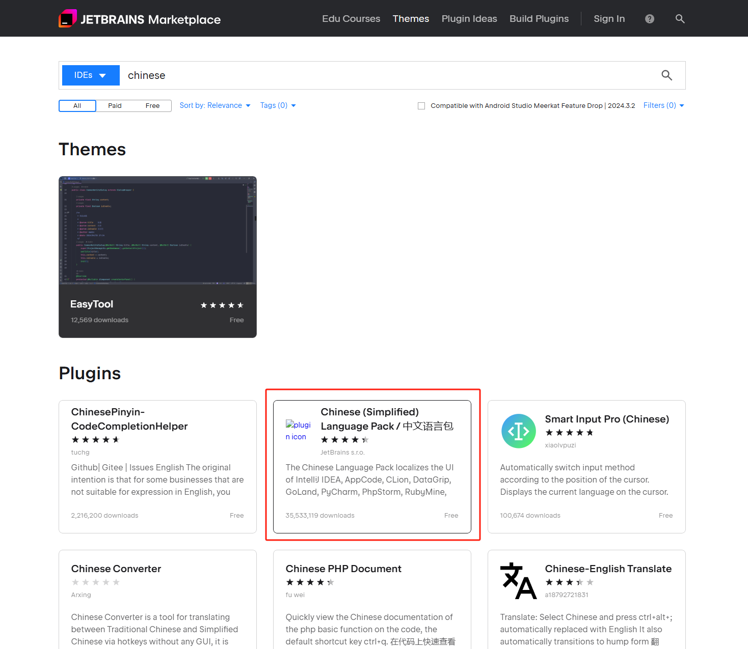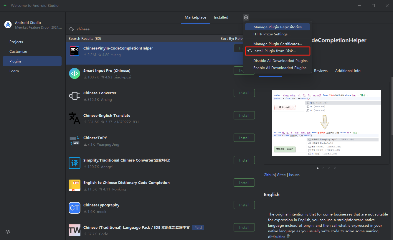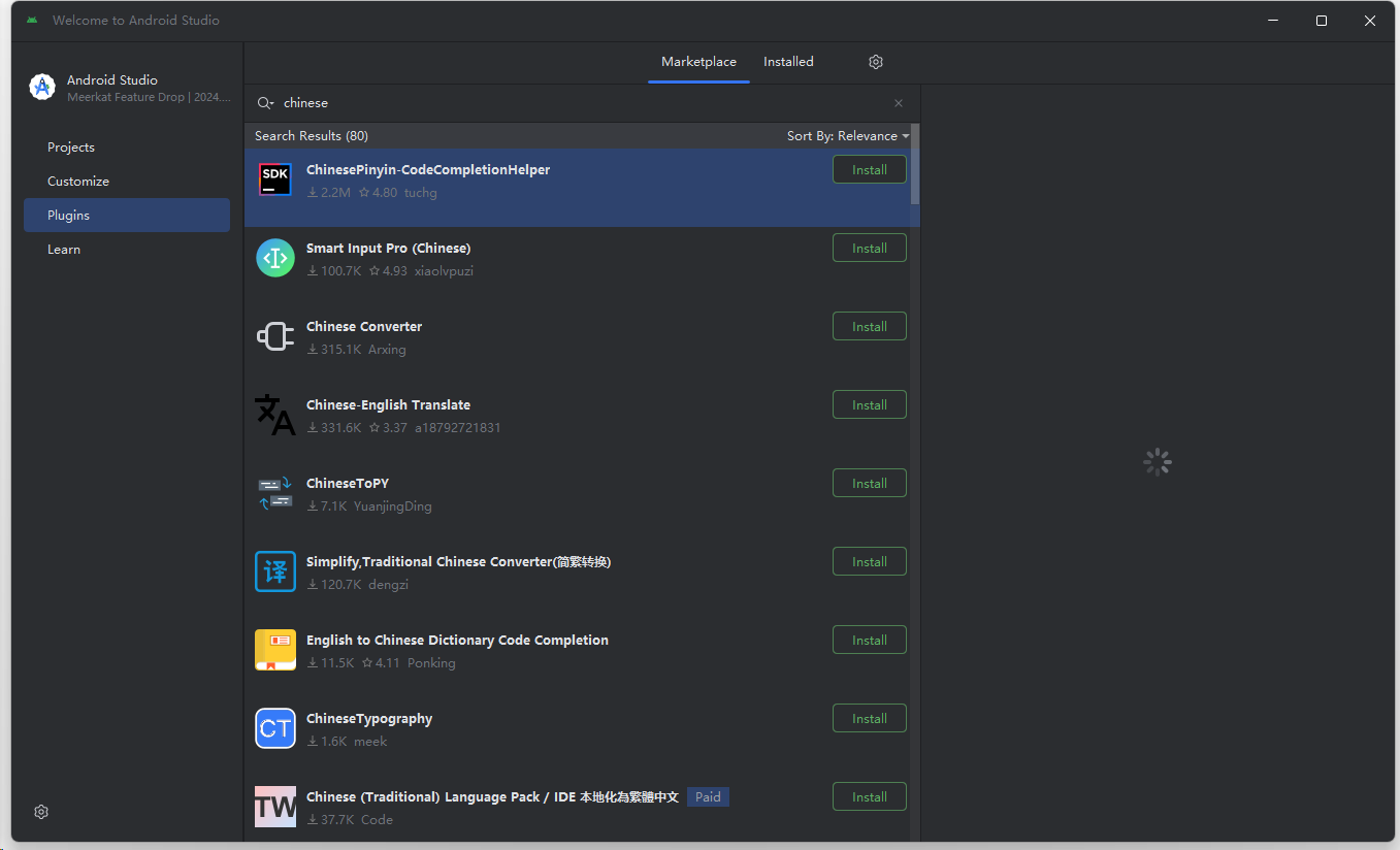 Android Studio的Marketplace并没有类似的中文语言包,搜索chinese时,优先度最高的貌似是一个编程插件?