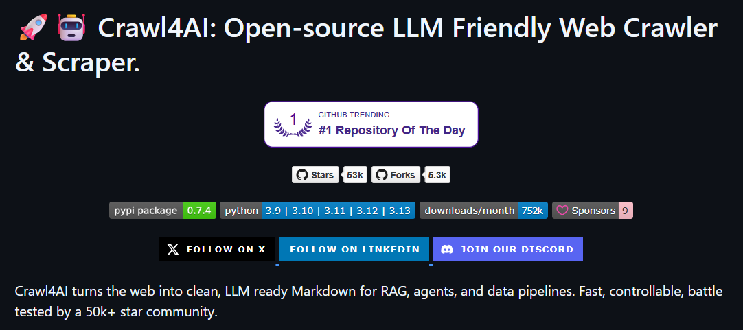 Crawl4AI是一个专门为大语言模型(LLM)和AI应用设计的网页爬虫工具。与传统爬虫不同,它的特别之处在于生成的内容格式更适合AI模型处理。